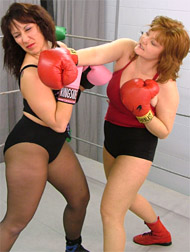 What we've got for you is a non-stop battle, several knock-downs, with both girls relentless with the gloves, targeting head and body in their effort to take the match. But with so much wrestling in their blood, at times they don't stop even when a gal is backed into the corner or even on the mat.