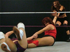 In wresting, there are often some uneasy alliances, but such is not the case with this pairing of grapplers. Hellena appeared to have gained respect for Lee due to her methods of dealing with AJ, and Becca sort of has an "enemy of my enemy is my friend" approach to life. A ref could not be found at the last minute, so the girls agreed to behave, stay in their corners, tag legally... yeah, we weren't buying into it EITHER.