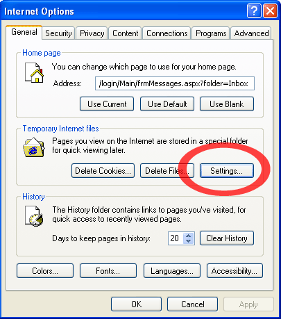 CLICK TEMPORARY INTERNET SETTINGS This example is from Internet Explorer 6.0. Note, you may have to click "DELETE FILES..." if you have a large number of temporary files on your hard drive.