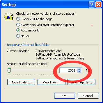 INCREASE TEMPORARY CACHE This example is from Internet Explorer 6.0. Be sure this file setting is at least twice the size of the video you are downloading. It may need to be even higher if you have a lot of files in your temporary folder.