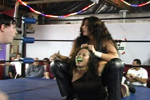 BUT... that didn't end it! Jenny Taylor AND Cindy Rogers ran from the back to put THEIR two-cents worth in, and the final toll from THIS battle was the challenge of a TAG-TEAM match! No one wanted to go to intermission right then, but at least they knew when the break was over, they new EXACTLY what was waiting for them in the next match!