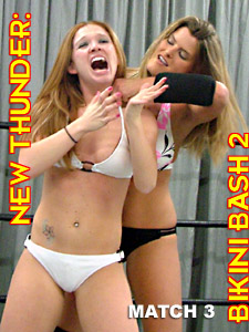 While Jenelle has an edge in experience, Nevaeh brings a lot of aggression to her trade, so odds-makers might not give more than 50-50 chances to either of these girls! It becomes an unexpected 2-fall affair, as one of these battling beauties succumbs to knockout by nerve-pinch, and her opponent waits until she comes to to put her down again with an unyielding sleeper hold!