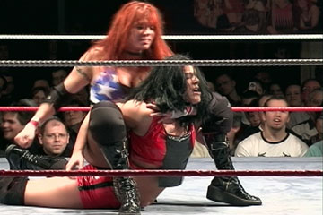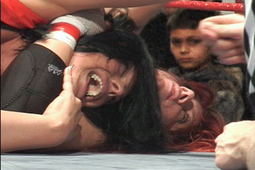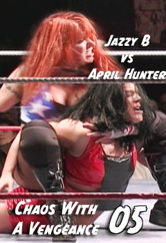 There are big girls and there are bad girls, and sometimes there are BIG, BAD GIRLS! Such is the case in this "iron woman" match, as the match will run at least 30 minutes before any winner can be declared! April Hunter is one of OUR favorite ladies, super-cool outside the ring, super-mean inside it. But as Jazzy B appears in her pre-match statement, April's size and reputation means nothing to her. All that matters is the Queens of Chaos Title!