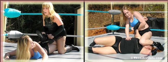 This is a fabulous 2 out of 3 fall event, no ref, but a small group of fans cheering on their favorites as these lovely little dynamite dames throw each other from post to post, and chop, kick, and punch either other with vicious abandon! The first fall is taken by a pin finish.