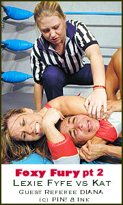 A couple of things distinguish this bout, first of course, it being one of our most dynamic matches with a couple of the most dynamic ladies. You might think Kat's size advantage would make the Foxy Lady easy pickings, but Lexie's got more than her share of tricks, and rule number 1, is don't get Lexie mad!