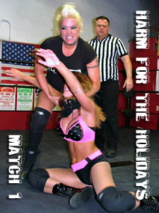 It's our opening match from our December 2008 show "HARM FOR THE HOLIDAYS," as home-town girl SIN-D takes on BOBCAT and her manager SNOWFLAKE! SIN-D has to not only handle BOBCAT's rough-house tactics, but she better not turn her back on that little manager either!